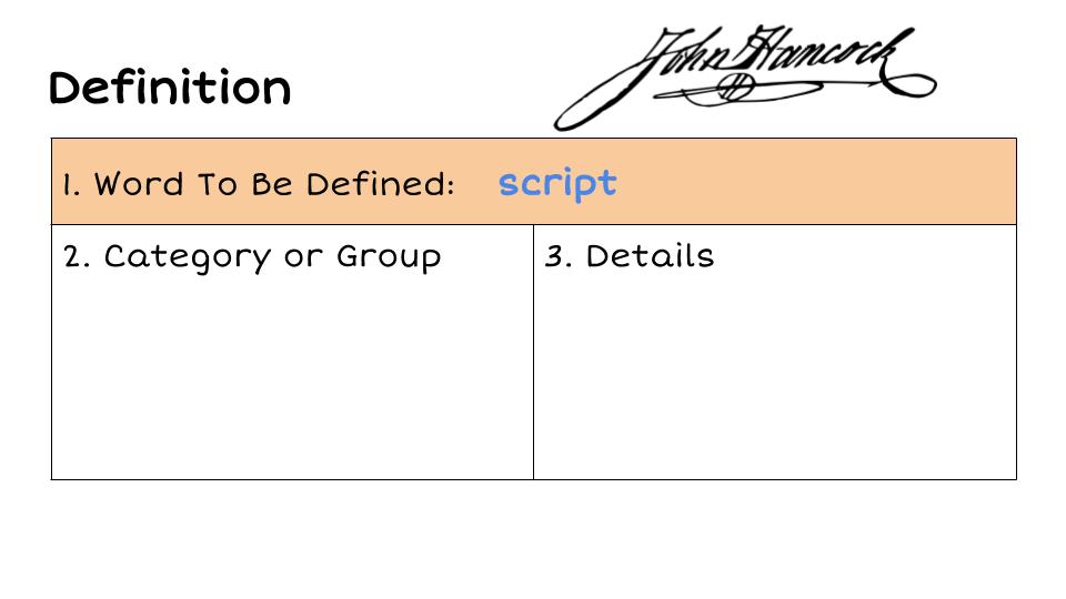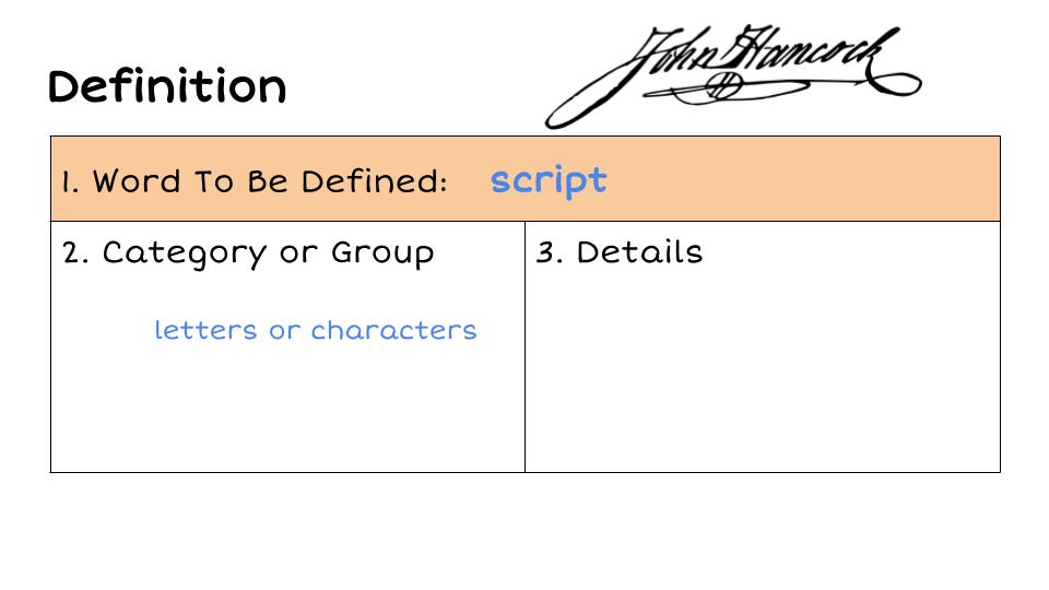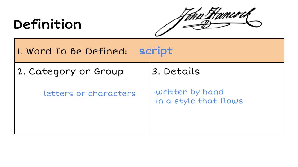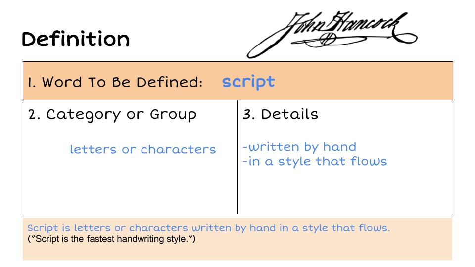 Here is an example of how the Definition Building Procedure works in the Lexercise Structured Literacy Curriculum™ (Level 9) using the word script: